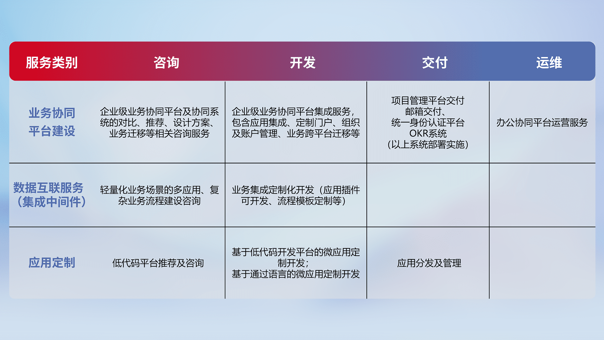 针对钉钉、、、、企微、、、、IDaas等平台级产品提供产品的规划、、、、方案、、、交付、、、定制化开发等服务,,实现如统一协同办公、、、、智能客户服务、、、、混合会议管理、、智能数据查询、、等业务场景,,,实现数字化转型。。